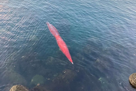 Un calamar gigante de 2.5 metros de largo fue captado por dos buceadores japoneses mientras nadaban en las costas de la localidad de Toyooka, imágenes poco comunes para estar cerca de una bahía.
