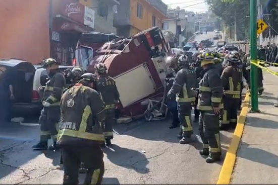 Al menos tres personas resultaron lesionadas tras la volcadura de un camión de bomberos en la alcaldía Magdalena Contreras.