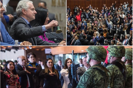 “Los honores a la Bandera se hicieron en el vestíbulo porque los integrantes de la escolta están armados, y en este salón de sesiones no pueden entrar armados. Convenimos con la Secretaría de la Defensa el protocolo correspondiente para honrar a nuestra Bandera”, argumentó.