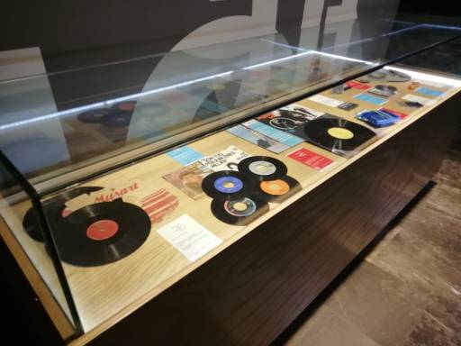 Otras vitrinas del lugar sí se veían limpias y arregladas. En una de ellas están discos de diferentes tiempos, incluso de acetato, minidisc, discos compactos y USB con letreros en los cuales se explica sobre su origen y función. A un lado, una muestra de un carrete de cinta AMPEX que las usábamos mucho en las grabaciones de nuestras notas en cabina.