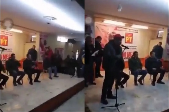 En el video que circula por redes sociales, se ve al hombre tomar la palabra con el micrófono en el evento realizado en Parras: