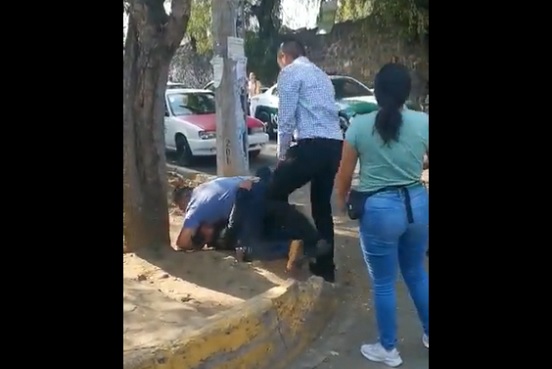 En un video que ha circulado en redes se ve como el conductor que está vistiendo una playera azul le lanzó golpes al policía mientras que la persona que estaba grabando le decía al chófer de la camioneta negra: