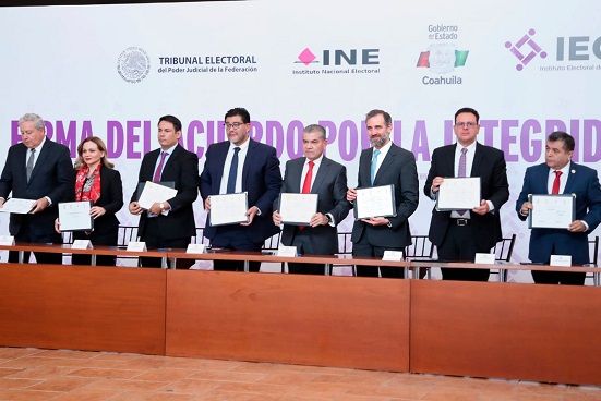 Autoridades electorales federales y del estado de Coahuila, el gobierno de la entidad y representantes de partidos políticos, firmaron el Acuerdo por la Integridad Electoral del Proceso Electoral 2023. En él, se comprometen a respetar las leyes en materia electoral, contribuir a la celebración de procesos electorales íntegros, así como a procesar las diferencias a través de los cauces institucionales, para que las y los coahuilenses tengan las elecciones íntegras que merecen.