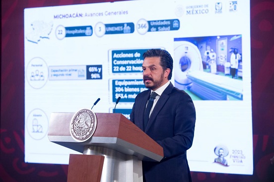 En Michoacán se tiene presencia en 22 hospitales, tres Unidades de Especialidades Médicas (Uneme) y 366 centros de salud, el surtimiento alcanzó 96 por ciento. Se han hecho acciones de conservación en los 22 hospitales, se han adquirido 304 bienes por 53 millones de pesos.