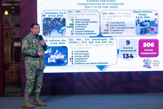 Explicó que se logró el aseguramiento de líderes y brazos operativos de los carteles del Golfo, el Pacífico, Jalisco Nueva Generación, entre otros. «En Matamoros el día 7 de febrero, tres personas, participó el ejército Guardia nacional CNI y Fiscalía General de la República, aquí esta persona es un líder que se dedicaba al tráfico de personas y trasiego de drogas hacia Estados Unidos son del Cártel del Golfo (los Ciclones)”, dijo.