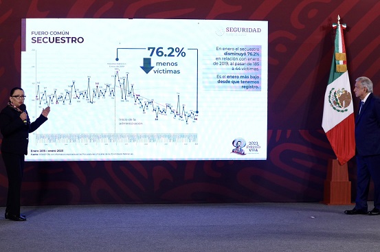 «Hay que decir que el mes de enero, de todos los meses anteriores, es el más bajo desde que tenemos registro de secuestros, desde el año 2015”, refirió Rosa Icela, quien detalló que en esta materia, en la actual administración se llevan un total de 4 mil 973 detenidos; 557 bandas desarticuladas y 2 mil 208 víctimas liberadas.