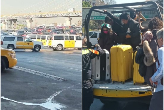 Policías de tránsito apoyan a los usuarios afectados trasladándolos a bordo de patrullas con todo y equipaje para no perder sus vuelos.