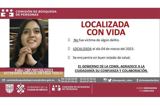 Estefanía Angelic Ortega, de 16 años, fue localizada con vida, luego de que fuera vista por última vez el 1 de marzo en la colonia Lomas de Padierna, alcaldía Tlalpan.