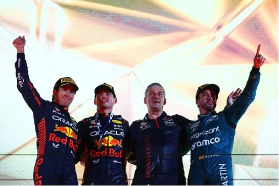El podio final en el circuito de Sakhir lo completó Sergio Pérez y Fernando Alonso, para concluir un fin de semana perfecto para la escudería austriaca, que además tuvo la presentación estelar de Aston Martin, que lució superior a equipos como Mercedes, Alpine y McLaren, para conseguir un histórico podio con el veterano español, tras las fallas mecánicas presentadas con Ferrari al final de la carrera.