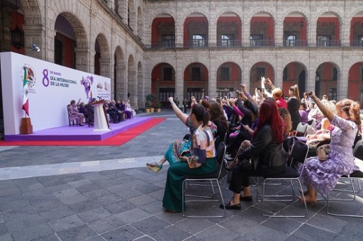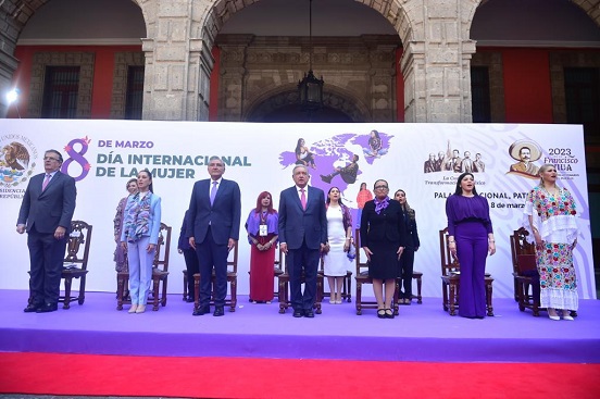 Entre aplausos, agradecimientos y al grito de es un honor estar con obrador de funcionarias, el presidente Andrés Manuel López Obrador encabezó el Día Internacional de la Mujer en el Patio Central de Palacio Nacional.