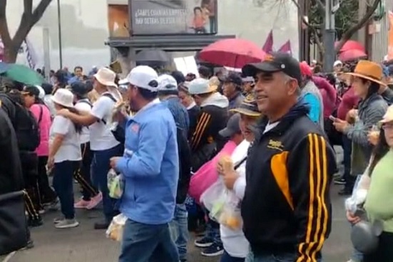 Sobre avenida Juárez, integrantes del Sindicato Nacional de Trabajadores de la Educación (SNTE) regalaban a transeúntes un lunch, el cual incluía una torta.