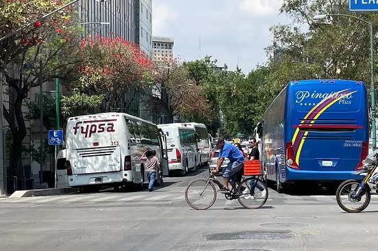 En calles como Artículo 123, López, Victoria y Morelos, cerca de las 13:00 h ya es posible observar gran cantidad de autobuses, algunos que, incluso, infringen el reglamento de tránsito pues no es está permitido estacionarse en la zona.