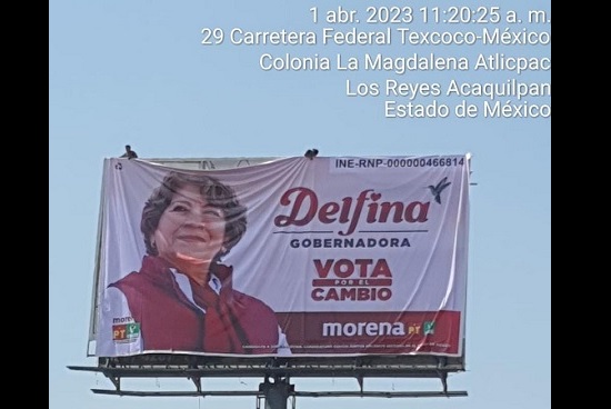 Detalló que este día se puede observar propaganda de Delfina Gómez en espectaculares sobre la carretera federal Texcoco-México, en la colonia La Magdalena Atlicpac, municipio de Los Reyes La Paz, Estado de México.