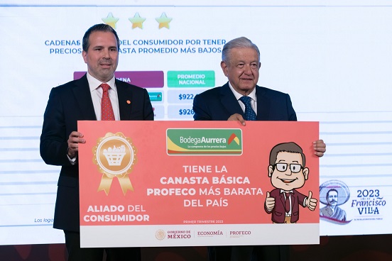 Durante la conferencia matutina de López Obrador, el procurador Ricardo Sheffield expuso que, durante el primer trimestre del año, Bodega Aurrera promedió a nivel nacional un precio de 922 pesos con ocho centavos en la canasta básica de 24 productos para la que el Gobierno federal acordó un costo máximo de mil 039 pesos en octubre pasado.