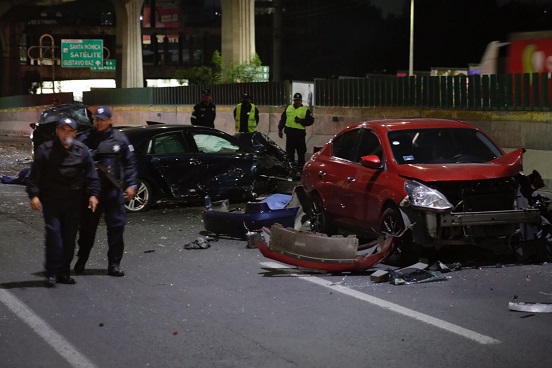 A la cuenta @esprimeralinea fueron subidas imágenes del accidente en que se observan dos de las unidades siniestradas, justo a la altura del señalamiento en que se indica la ruta para Santa Mónica, Satélite y Gustavo Baz, además de varios uniformados en el lugar.