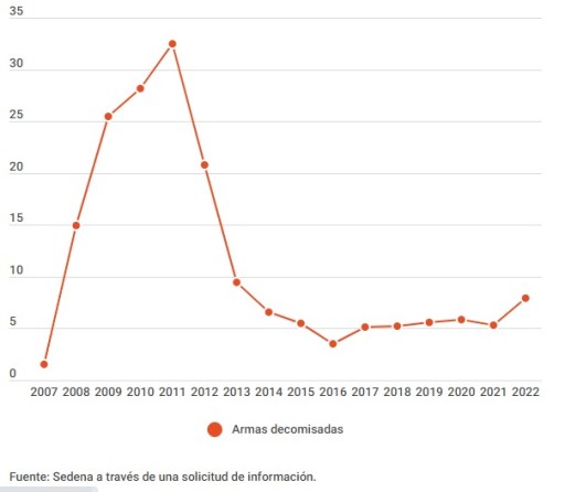 De acuerdo con datos de la Secretaría de la Defensa Nacional (Sedena), desde enero de 2007 y hasta diciembre de 2022, en el país han sido decomisadas 186,955 armas de fuego, que representan en promedio a 31 armas decomisdas cada día.