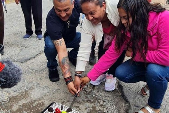 Estas son las mañanitas / Que cantaba el rey David / Hoy por ser día de tu santo /Te las cantamos aquí… se entonaron con acompañamiento de mariachi los vecinos de la colonia San Bartolo ubicada en Pachuca, Hidalgo para festejar 20 años de un bache.