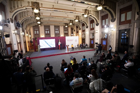 El presidente Andrés Manuel López Obrador ofrece su conferencia de prensa matutina este martes 18 de abril en Palacio Nacional. Lo acompañan el almirante Rafael Ojeda Durán, el general Luis Cresencio Sandoval y la secretaria Rosa Icela Rodríguez.