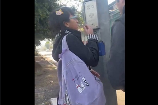 En las imágenes se observa a la joven que lleva una mochila color lila y una chamarra negra con vivos blanco y negro en los puños.