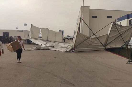El incidente se registró a unos metros del pabellón de exhibición de un avión, donde una lona blanca de aproximadamente 30 metros de longitud por 15 metros de altura, montada en una estructura metálica tubular, colapsó por los fuertes vientos.