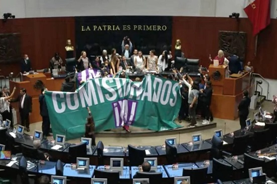 Cerca de las 16:05 horas, Alejandro Armenta se vio obligado a decretar un receso, debido a la toma de la tribuna y a la postura de senadoras de Kenia López Rabadán, quien arrebató el micrófono a Eduardo Ramírez, presidente de la Comisión de Puntos Constitucionales, quien pidió votar la 3 de 3 contra la violencia a la mujer.