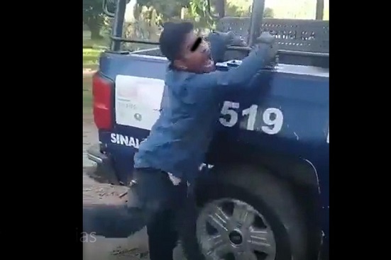 En el video aparece esposado a la patrulla 3519 de la Policía Municipal, mientras un elemento lo golpea con una tabla y otro aparentemente graba, incluso le piden voltear a la cámara mientras es castigado.