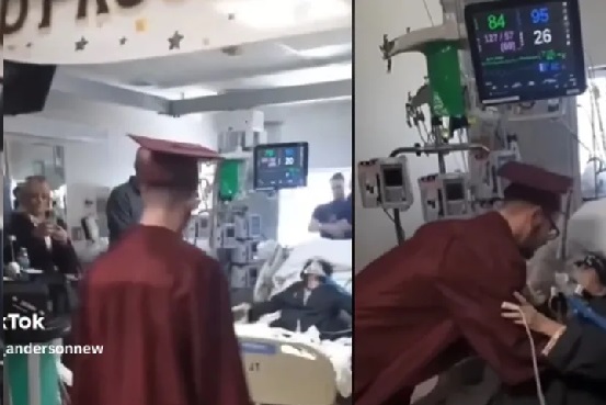 En Estados Unidos se ha hecho viral un video en el que un joven decidió graduarse en el hospital donde se encontraba internada su madre enferma, quien estaba a punto de morir, ya que uno de sus últimos deseos era poder ver a su hijo graduarse de la preparatoria.