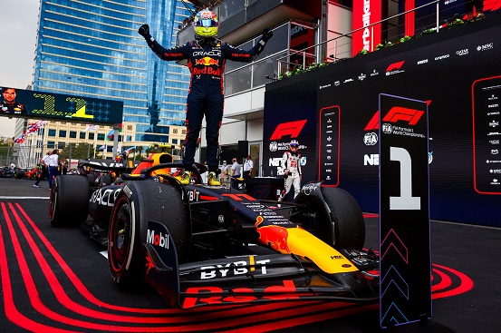 El mexicano Sergio ‘Checo’ Pérez (Red Bull) se apuntó un histórico triunfo en el Gran Premio de Azerbaiyán de la Fórmula 1 luego de convertirse en el primer piloto que repite una victoria sobre el circuito callejero de Bakú, superando a su compañero Max Verstappen (2do) y al monegasco Charles Leclerc (Ferrari) que completó el podio.