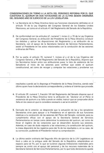 Y es que, en su edición del 30 de abril de 2023, el periódico Reforma publicó una nota titulada “Falsifican senadores quórum para voto”, donde se señala que dos votaciones de la Sesión Ordinaria referida no corresponden a los votos emitidos: