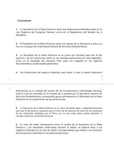 “Por lo que toda declaratoria queda respaldada con los registros generados de las votaciones, tanto en el sentido dado por cada senador en particular, sea a favor, en contra o abstención, así como en el conteo general, lo cual podrá comprobarse en los elementos documentales de dicha Secretaría General, así como en la Versión Estenográfica y los registros audiovisuales del Canal del Congreso”, explicó el senador.