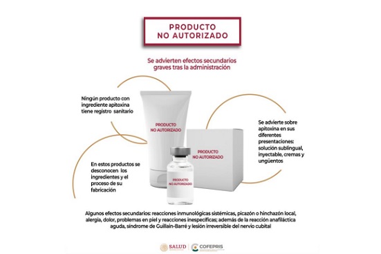 La Comisión Federal para la Protección contra Riesgos Sanitarios (Cofepris) emitió una alerta sobre el uso de apitoxina, ya que no ha otorgado registro sanitario a ningún producto que la contenga, por lo que su uso podría poner en riesgo a quien la utilice debido a que carece de estudios que avalen su calidad y seguridad.