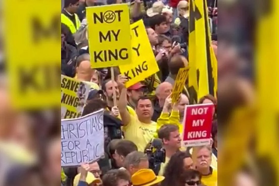 Al grito de “Not my king”, “No es mi rey”, docenas de personas ataviadas en ropas amarillas protestaron exigiendo la abolición de la monarquía previo a la coronación número 40 del Reino Unido.