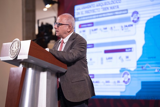 Diego Prieto, director del Instituto Nacional de Antropología e Historia (INAH), presentó su informe en la conferencia de prensa en Palacio Nacional, donde detalló que se tiene ya un avance del 90 por ciento del salvamento arqueológico en el Tramo 6 del Tren Maya.