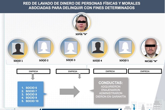 «Ahora bien, estas siete personas -Sofía Soraya “N”, Nicias René “N” y las otras- probablemente relacionadas en esta red de lavado de dinero, habrían operado por sí e interpósita persona a través de tres empresas de distintos giros, como una constructora, otra que aglutina centros educativos privados y otra más dedicada a inversiones», puntualizó.