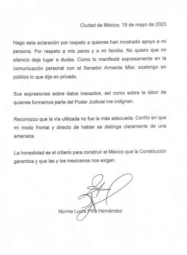 Abundó que la aclaración es “respecto a quienes han mostrado apoyo a mi persona. Por respeto a mis pares y a mi familia. No quiero que mi silencio deje lugar a dudas. Como lo manifesté expresamente en la comunicación personal con el senador Armenta, sostengo en público lo que dije en privado”.