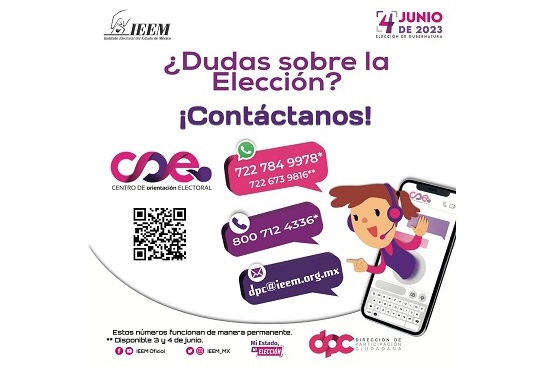 Para mayor información puedes consultar las cuentas de las redes institucionales del IEEM en YouTube y Facebook (IEEM Oficial); en Twitter e Instagram identificadas como @IEEM_MX; llamar al Centro de Orientación Electoral (COE) al 800 712 4336 o enviar un mensaje de WhatsApp al 722 784 9978.