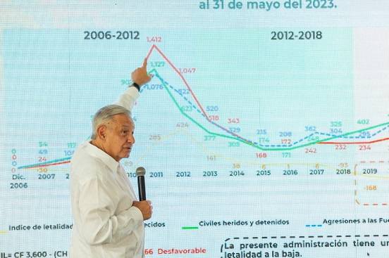 “No permitimos como era antes la tortura, no permitimos la desaparición, el Estado no desaparece a ninguna persona, no se autorizan masacres como era antes. Desde el Estado, si vemos el índice de letalidad, vamos a ver con mucha claridad la diferencia, antes en los enfrentamientos eran más los muertos que los heridos y detenidos, esto es Calderón cuando la guerra”, afirmó.