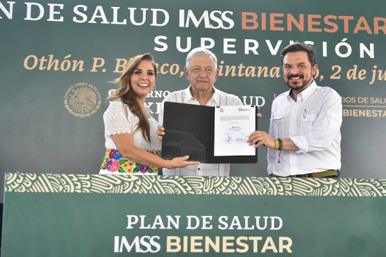 El presidente Andrés Manuel López Obrador firmó como testigo de honor el documento que estipula el inicio del Plan de Salud IMSS Bienestar Quintana Roo, en compañía del director general del Instituto Mexicano del Seguro Social, Zoé Robledo Aburto y la gobernadora María Elena Lezama Espinosa.
