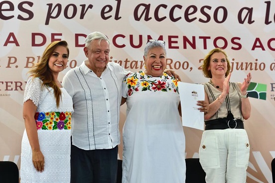 Al iniciar la gira de trabajo por Quintana Roo, el presidente Andrés Manuel López Obrador entregó certificados agrarios con el objetivo de brindar certeza jurídica y autonomía económica a las propietarias.