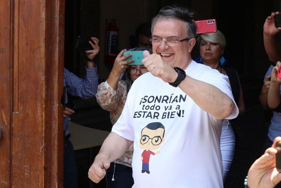 En Palacio Nacional, Ebrard Casaubón despojado del traje y la corbata, habló con los medios de comunicación portando una camiseta con la leyenda «¡Sonrían, todo va a estar bien!”.