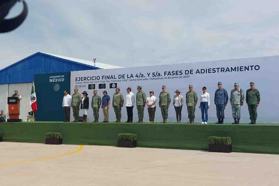 El secretario de la Defensa Nacional, general Luis Cresencio Sandoval González, encabezó esta mañana el Ejercicio Final de la Cuarta y Quinta Fases de Adiestramiento para el Ejército, Fuerza Aérea y Guardia Nacional, que se impartió en las instalaciones del CNA, ubicadas en el Campo Militar 42-A “General Francisco Villa”, en Santa Gertrudis.