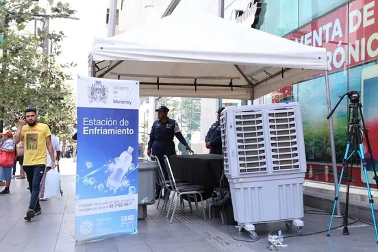 Ante la ola de calor que azota a Nuevo León, Protección Civil de Monterrey instaló módulos de hidratación a los cuales denominó «Estaciones de Enfriamiento» para mitigar las altas temperaturas.