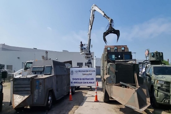 En las instalaciones de la delegación de Reynosa, Tamaulipas, de la Fiscalía General de la República (FGR), fueron destruido 14 vehículos con blindaje artesanal, de los denominados “monstruos”, que operaban grupos de la delincuencia organizada.
