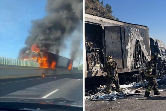Un tráiler que transportaba productos de aseo personal como shampoo y cremas se incendió en el kilómetro 28 de la autopista México-Cuernavaca con dirección a la Ciudad de México.