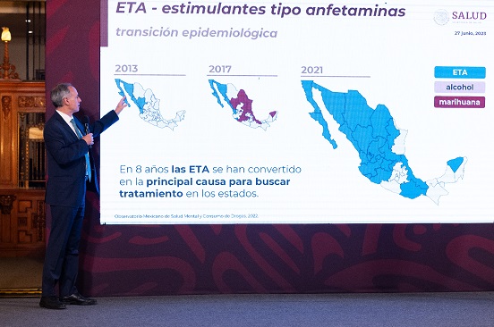 En la actualidad, el 46 por ciento de las personas que requieren atención por adicciones a drogas, consumen metanfetaminas en México, afirmó el subsecretario de Prevención y Promoción de la Salud de la Secretaría de Salud, Hugo López-Gatell. Señaló que en tan sólo 10 años (entre 2013 a 2023) la distribución y consumo de este tipo de droga pasó de estar concentrada en 6 entidades del noroeste del país a 21.