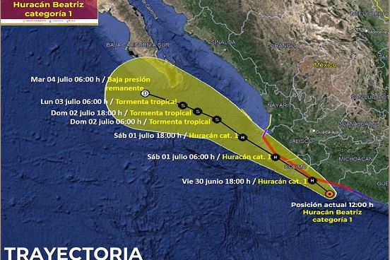 Por Beatriz hay zona de vigilancia por efectos de huracán desde Cabo Corrientes, en Jalisco, hasta Punta Mita, Nayarit; y hay zona de prevención desde Zihuatanejo, Guerrero, hasta Cabo Corrientes, Jalisco.