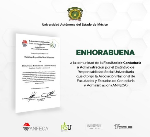 La Facultad de Contaduría y Administración de la Universidad Autónoma del Estado de México (UAEMéx) ha sido reconocida por su compromiso con la responsabilidad social universitaria. Gracias al desarrollo y aplicación de buenas prácticas, así como a la promoción de la calidad y la ética en su desempeño, la facultad ha recibido el Distintivo de Responsabilidad Social Universitaria otorgado por la Asociación Nacional de Facultades y Escuelas de Contaduría y Administración (ANFECA).