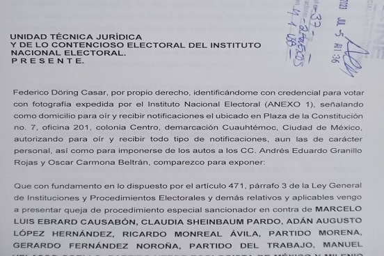 El diputado Federico Döring Casar presentó ante el INE una queja en contra de las corcholatas de MORENA y sus aliados, por la adquisición y difusión ilegal de propaganda en la Ciudad de México y a nivel nacional.