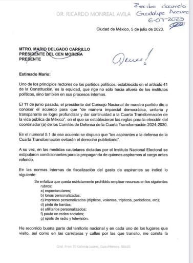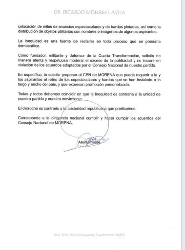 Ricardo Monreal dijo que, a través de una carta dirigida a Mario Delgado, dirigente nacional de Morena, le solicitó moderar el exceso de la publicidad de gran escala como espectaculares y bardas, de los aspirantes a la Coordinación de la Defensa de la Transformación.