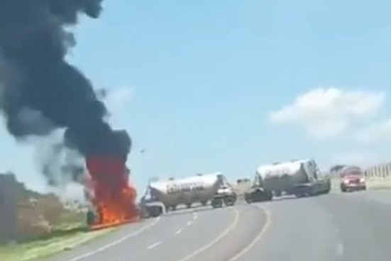 En varios videos que circula en redes sociales se puede ver dos contenedores de Cemento Cruz Azul obstruyendo la carretera y a un lado un coche en llamas.